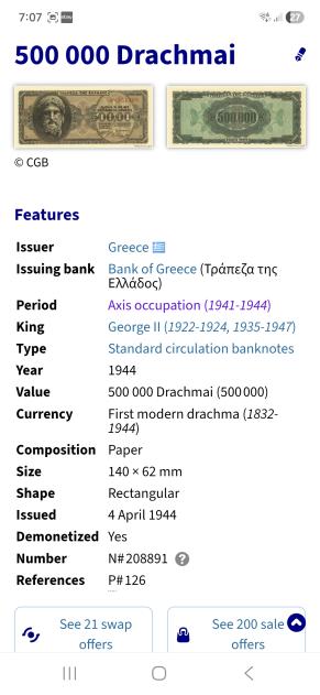 Greece (1941-1944 Occupation Inflation Series) 500, 000 Drachma 1944, XF Condition, Radar, Repeater & Palindrome Serial Number